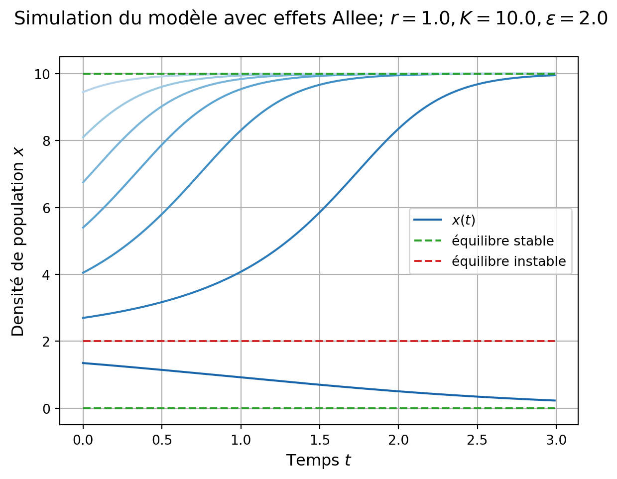 \dot x = r x \left(\frac{x}{\epsilon}-1\right)\left(1-\frac{x}{K}\right), \tag{3} avec r le taux de croissance intrinsèque de la population (par analogie avec la logistique), K la capcité de charge de l’environnement et \epsilon le seuil en dessous duquel la population n’est pas viable (‘seuil de Allee’). On procède comme ci-dessus.