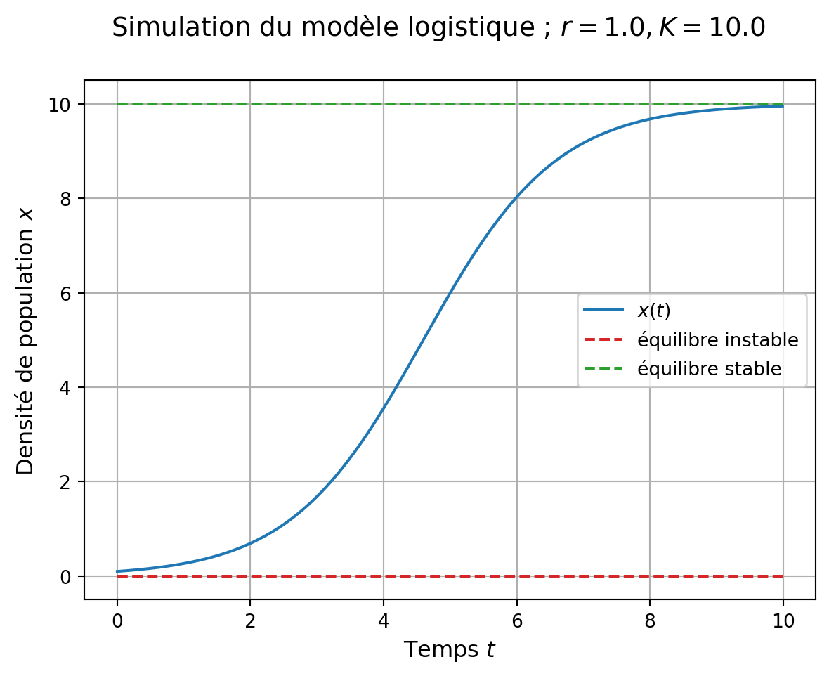 \dot x = r x \left(1-\frac{x}{K}\right), \tag{2} avec r le taux de croissance intrinsèque de la population et K la capacité de charge de l’environnement.