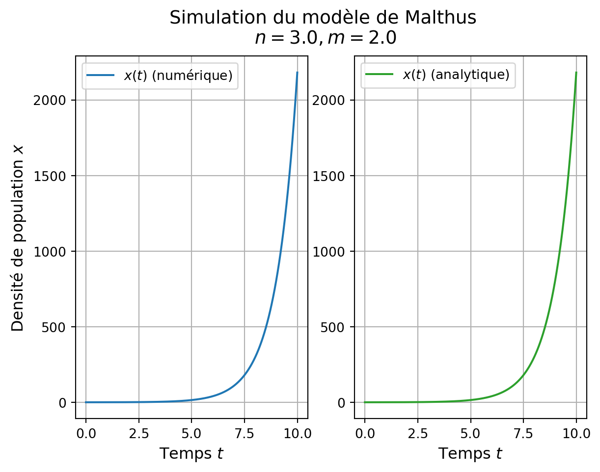 Nous considérons le modèle proposé par Malthus (1798) : \dot x = (n-m)x, \tag{1} avec n le taux de natalité, et m le taux de mortalité.